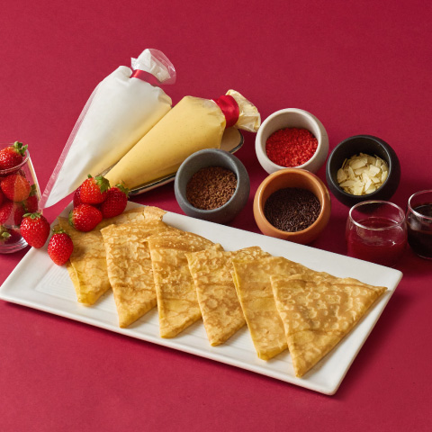 ホテリエが目の前で焼き上げるクレープを、自分好みにアレンジしてお楽しみいただけるコーナーもご用意いたします。クレープのアレンジには、ぜひお一人様カップ1杯までお取りいただける「フレッシュいちご」を添えてお召し上がりください。