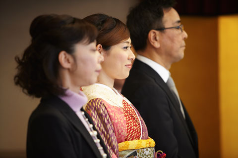 当ホテルでは、新郎はダークスーツ、新婦は振袖かワンピース、お父様はダークスーツ、お母様は訪問着またはワンピースが一般的です。 |